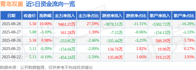 证券之星消息,青岛双星8月28日涨停收盘,收盘价5.5元。该股于10点0分涨停,未打开涨停,截止收盘封单资金为3948.84万元,占其流通市值0.88%。